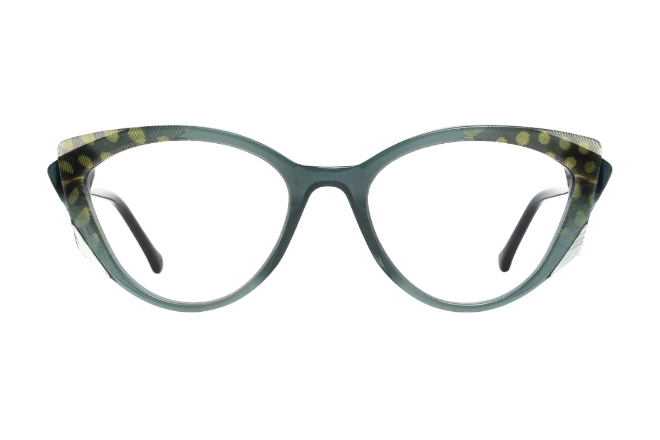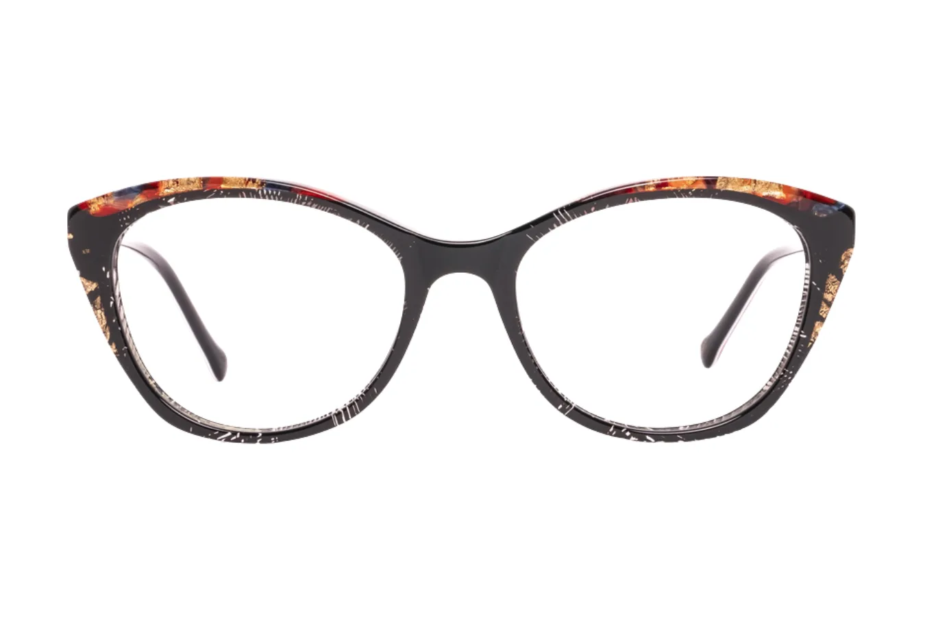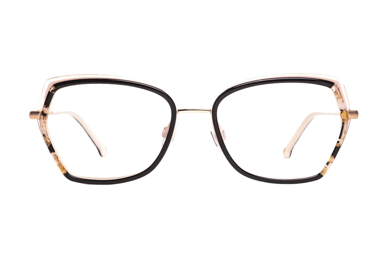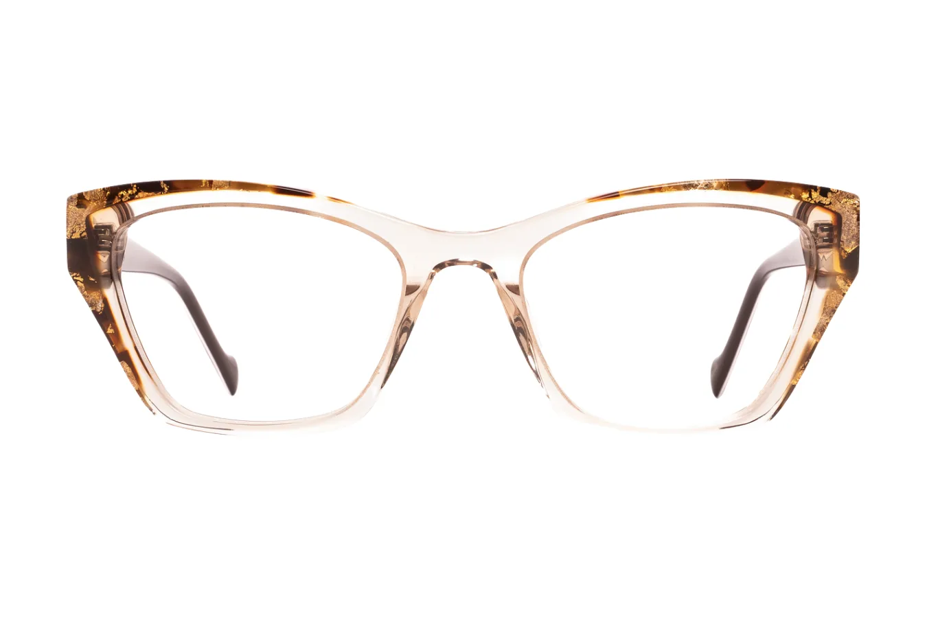 Šis katės akių formos rėmelis sukurtas taip, kad atkreiptų dėmesį. Jo priekis pagamintas iš skaidraus, šviesiai smėlinio atspalvio acetato, kuris suteikia lengvumo įspūdį. Viršutiniuose kampuose puikuojasi prabangūs vėžlio kiauto akcentai, kuriuose įterpti aukso spalvos blizgučiai. Šie detalūs elementai atrodo tarsi mažos juvelyrinės detalės, elegantiškai papuošiančios jūsų veidą.