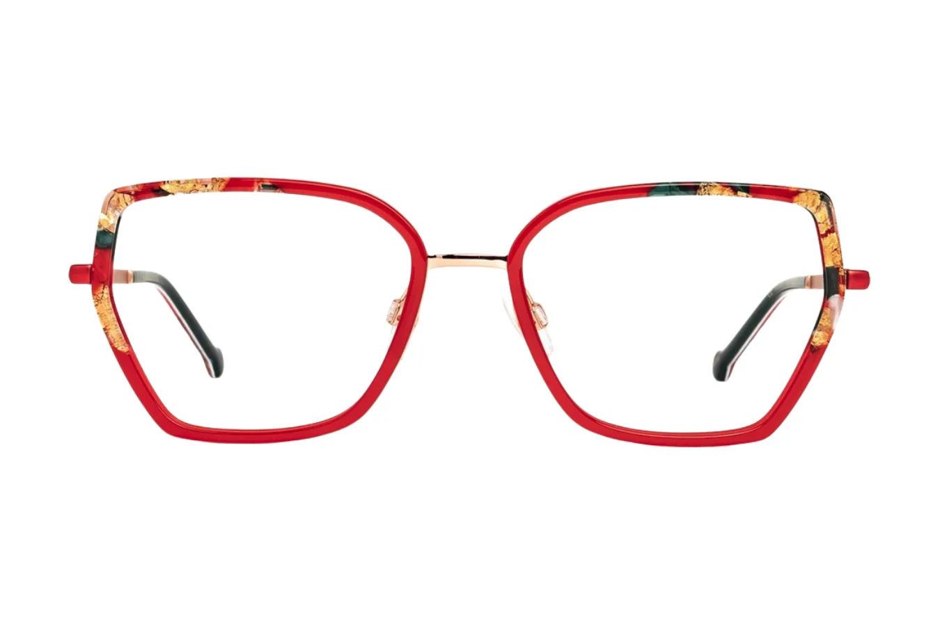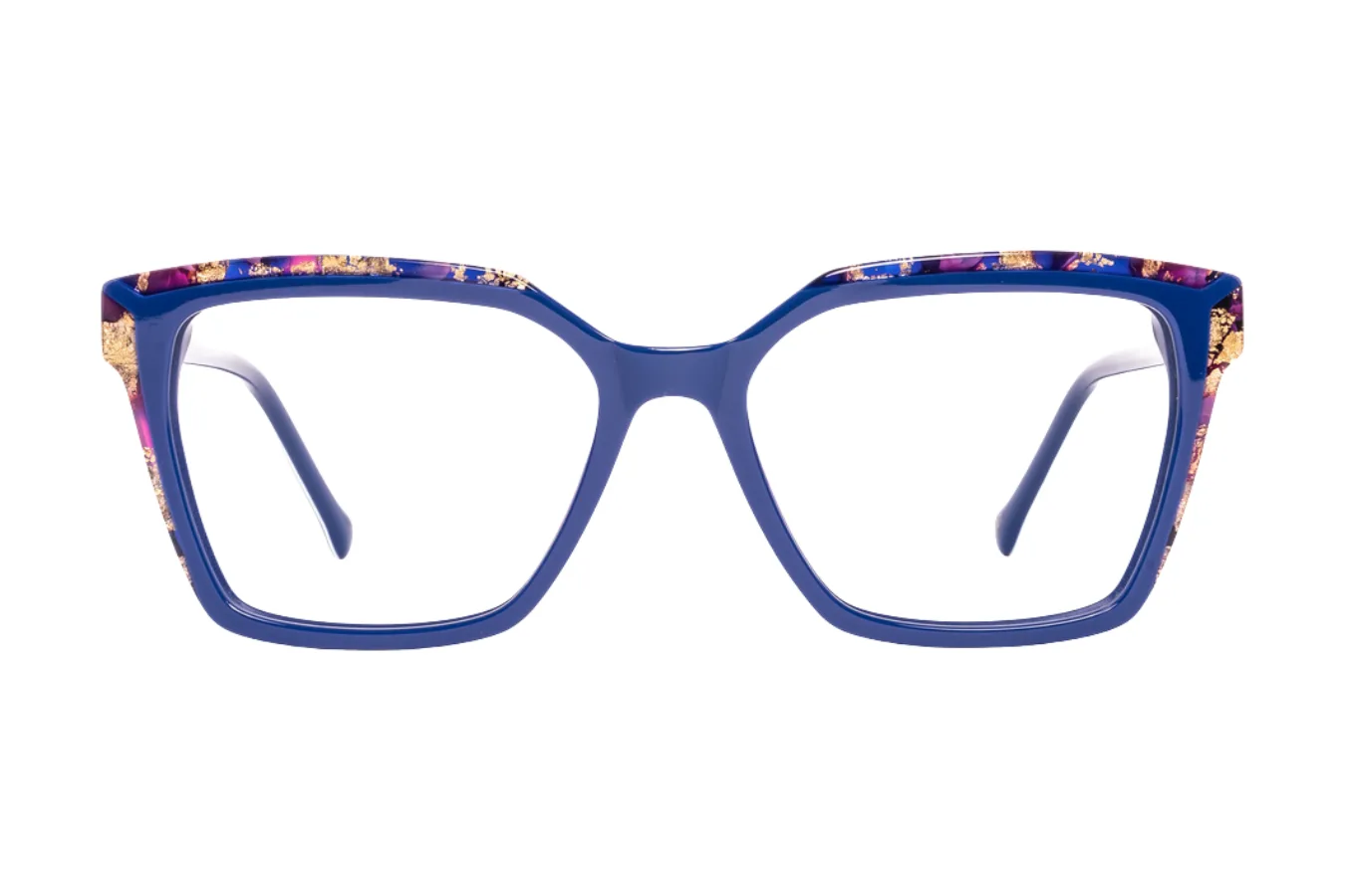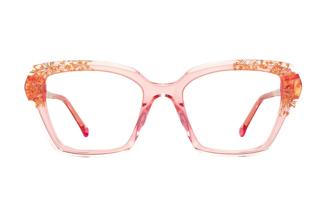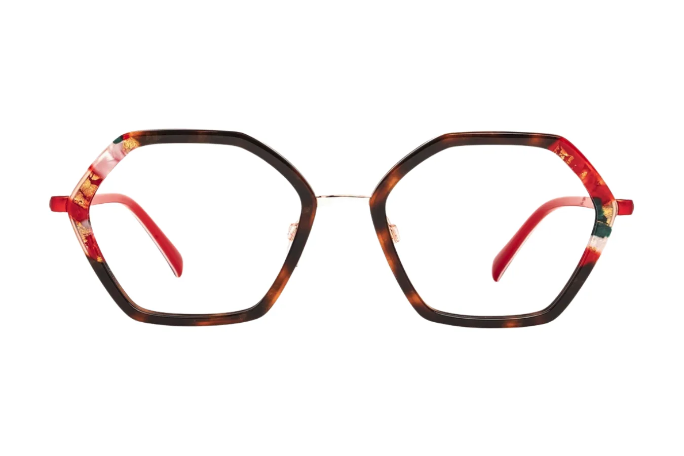 Šis katės akių formos rėmelis sukurtas taip, kad atkreiptų dėmesį. Jo priekis pagamintas iš skaidraus, šviesiai smėlinio atspalvio acetato, kuris suteikia lengvumo įspūdį. Viršutiniuose kampuose puikuojasi prabangūs vėžlio kiauto akcentai, kuriuose įterpti aukso spalvos blizgučiai. Šie detalūs elementai atrodo tarsi mažos juvelyrinės detalės, elegantiškai papuošiančios jūsų veidą.