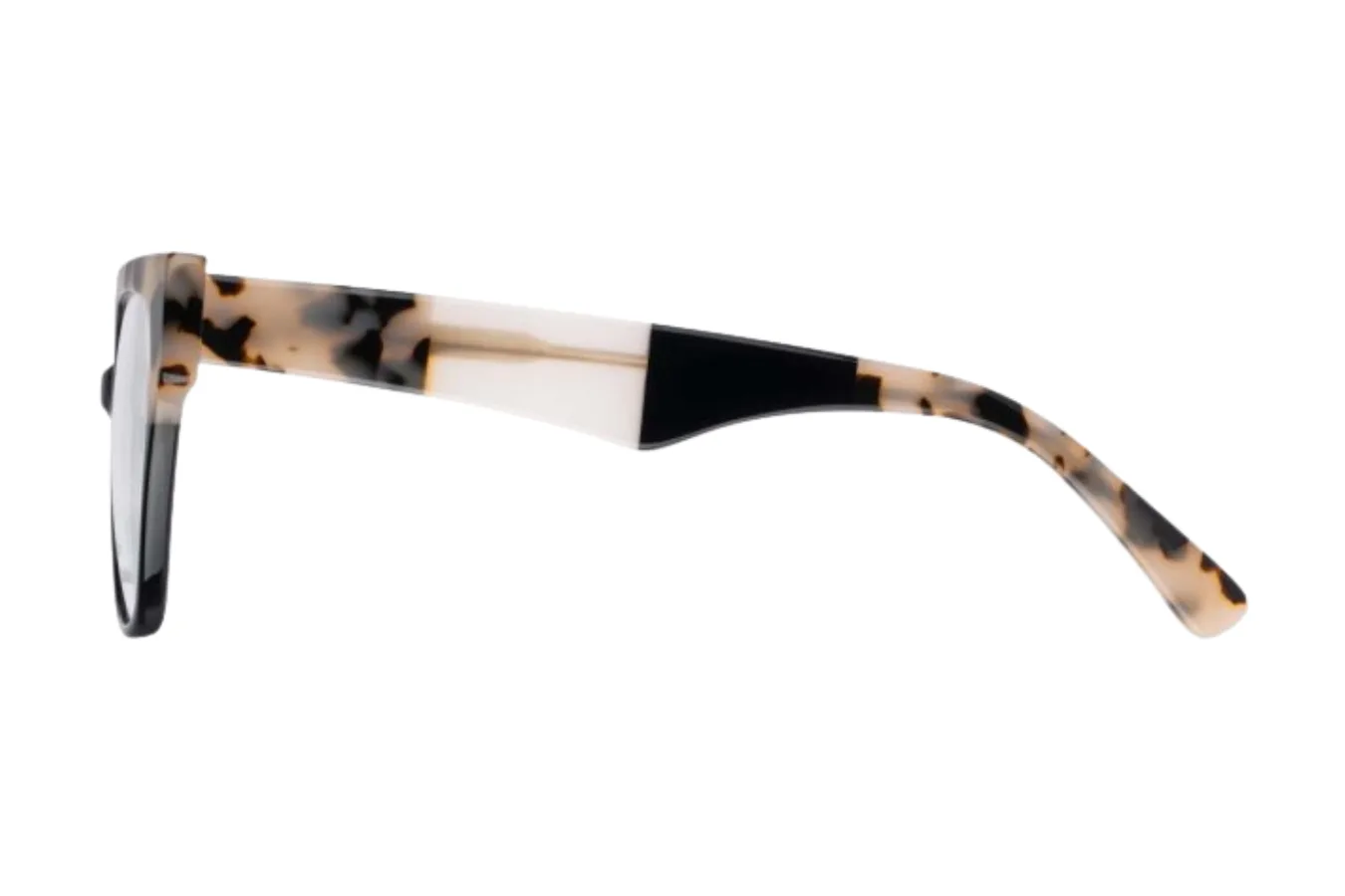 Šie išskirtiniai akinių rėmeliai pasižymi rafinuota ir madinga forma, primenančia katės akis. Viršutinė rėmelio dalis ir kojelės padengtos subtiliu vėžlio kiauto raštu šviesiais smėlio ir rudos spalvos tonais, kurie harmoningai dera su juodu, blizgiu apatinės dalies rėmeliu. Šis dviejų tonų dizainas suteikia akiniams prabangos jausmą ir stilingą išvaizdą.