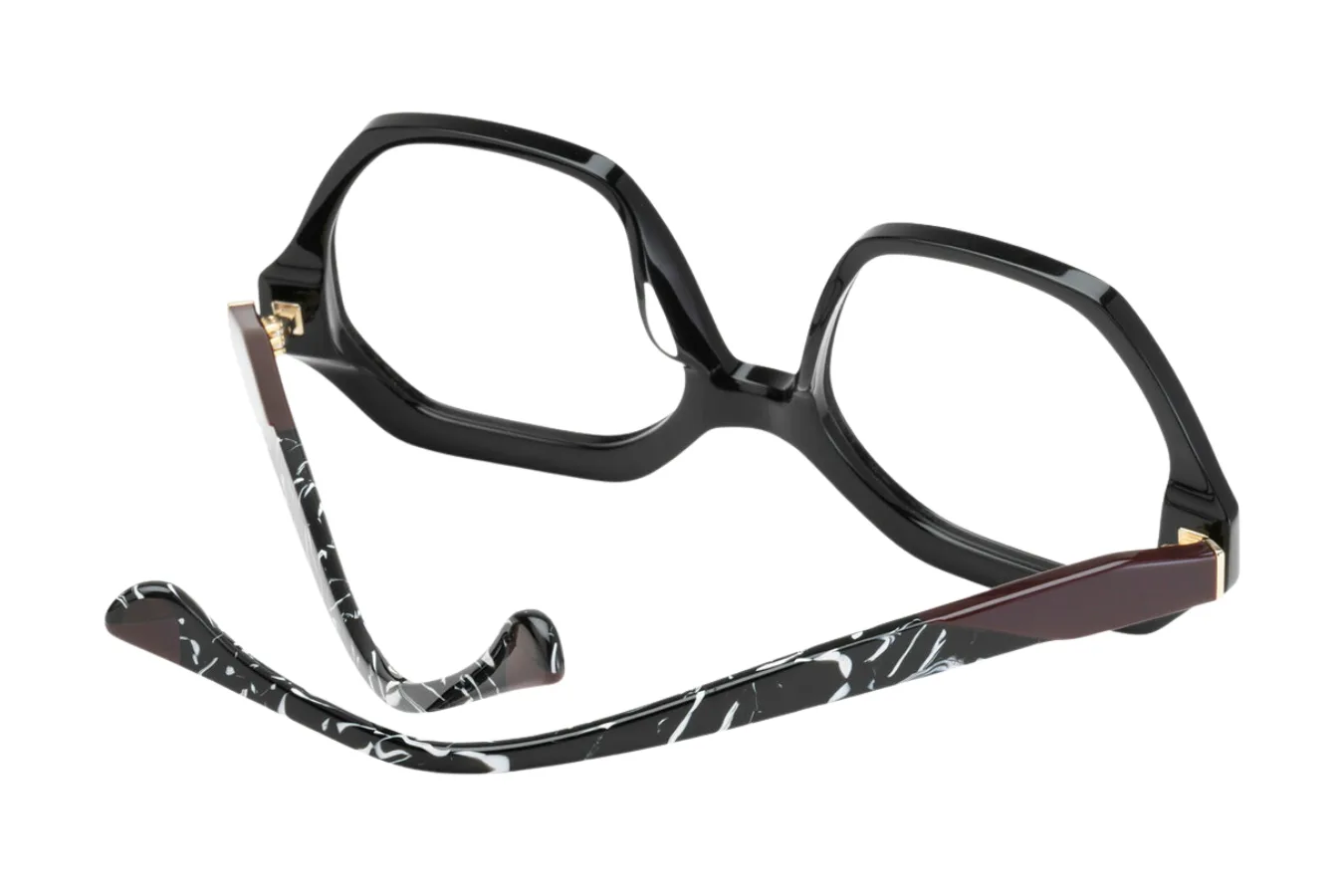 Šie išskirtiniai, drąsios geometrinės formos akiniai sukurti tiems, kurie vertina tiek klasikinį elegantiškumą, tiek šiuolaikišką stilių. CLOVER pasižymi storu, blizgiu juodu rėmeliu ir unikaliu kojėlių dizainu, kuris suteikia jūsų įvaizdžiui neįtikėtiną charakterį. Akinių priekis pagamintas iš aukščiausios kokybės juodo acetato, kuris sukuria tvirtą ir išraiškingą išvaizdą, o kojėlės papuoštos meniškais juodos ir baltos spalvos marmuro efekto raštais.