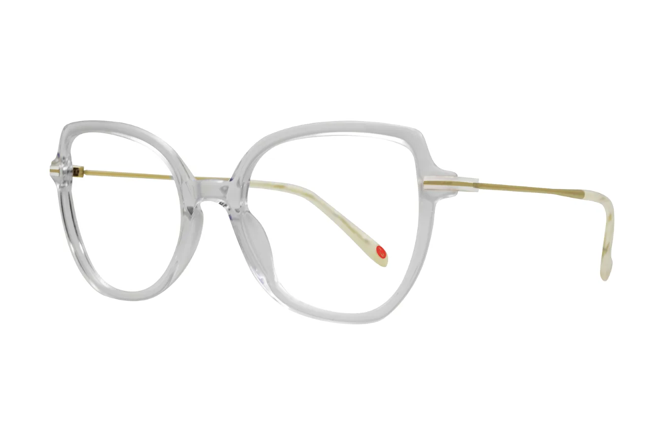 Didelis, šiek tiek pakeltas drugelio formos rėmelio siluetas švelniai išryškina akis ir suteikia veido bruožams patrauklumo. Plonieji aukso atspalvio metaliniai kojelės kontrastuoja su permatomu priekiu, pridėdamos elegancijos ir rafinuotumo. Įdomu tai, kad kojelių galiukai turi subtilų raudoną akcentą – tai išskirtinė dizaino detalė, liudijanti kruopštų meistriškumą.