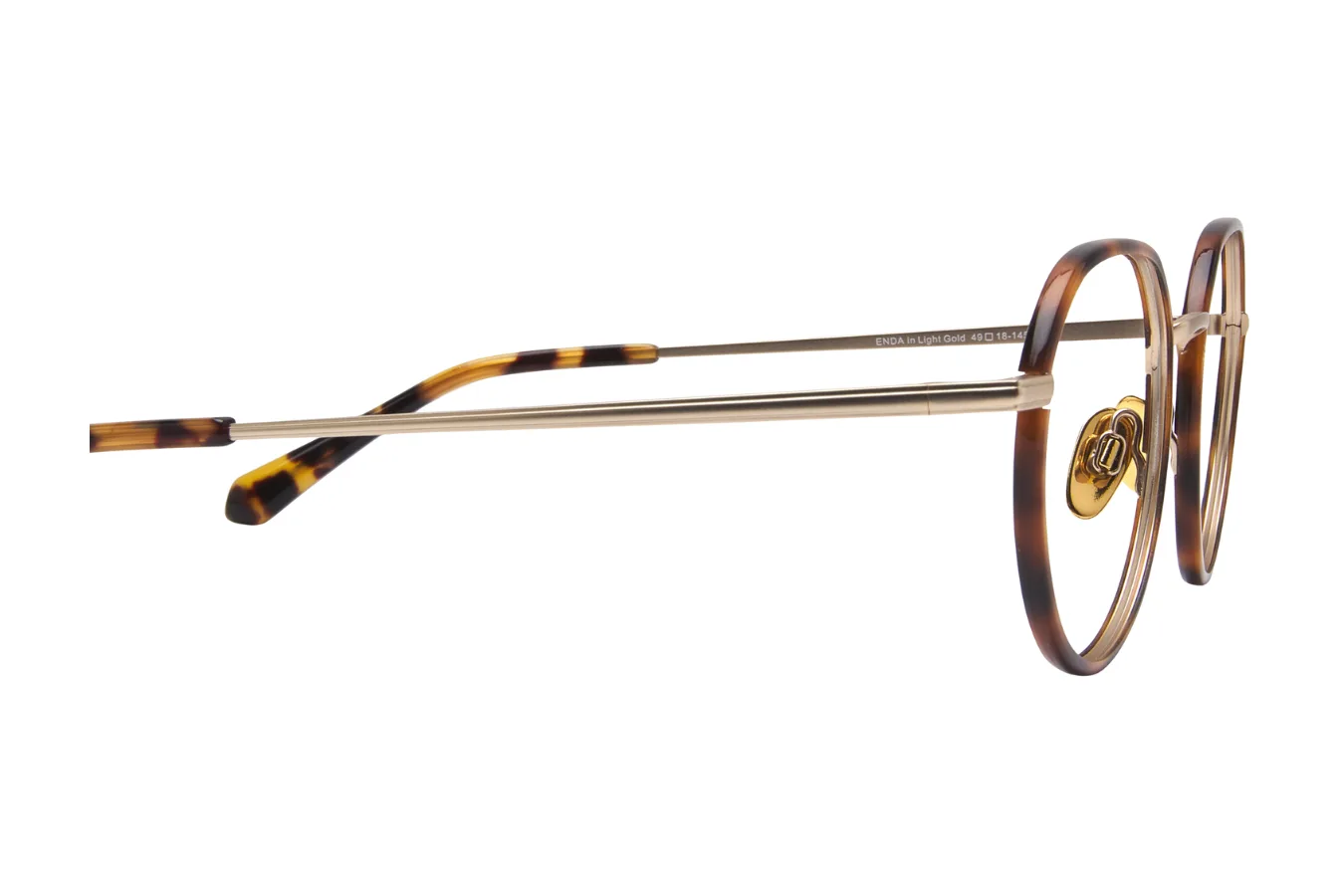 Plonos, lengvos metalinės kojelės šviesaus aukso atspalvio sukuria elegantišką kontrastą su rėmeliu, pereinančios į tokio paties vėžlio kiauto rašto acetatinius galiukus, užtikrinant vientisą ir rafinuotą išvaizdą. Šis išskirtinis medžiagų derinys ne tik pabrėžia dizaino unikalumą, bet ir sumažina bendrą svorį.