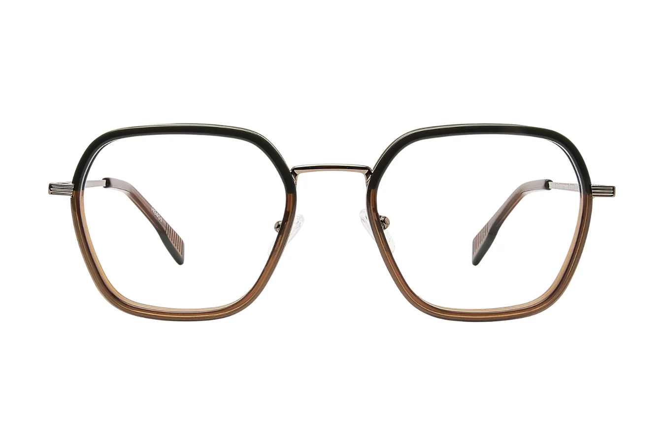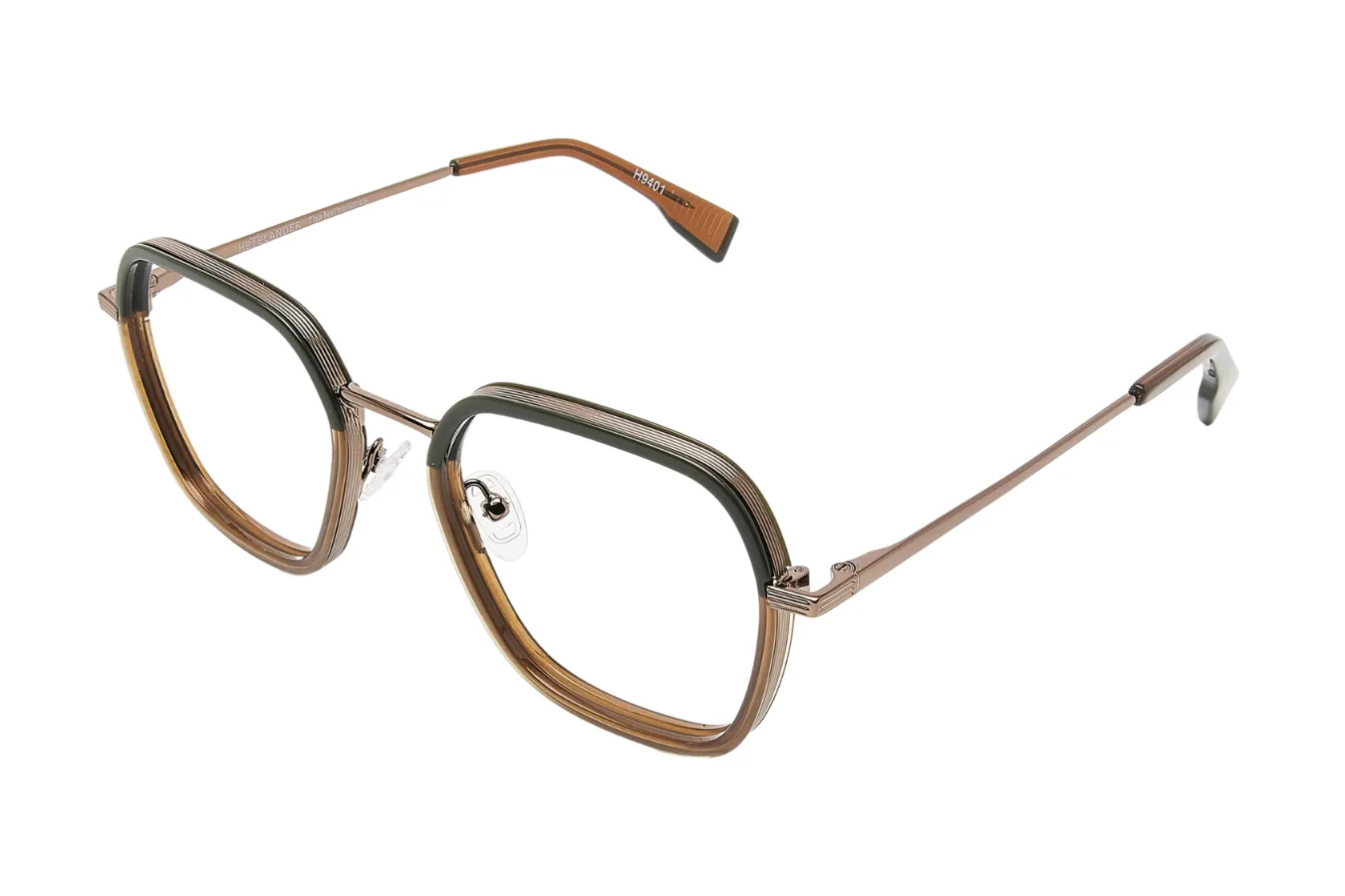 Šie išskirtiniai korekciniai akiniai pasižymi ypatingu dviejų spalvų deriniu – elegantiškas žalias atspalvis viršutinėje dalyje subtiliai pereina į šiltą rudą apačioje, sukurdamas nepakartojamą vizualinį efektą. Rėmelio priekis pasižymi architektūrinio stiliaus briaunuota struktūra, suteikiančia akinių rėmeliui gylį ir tekstūrą, kuri iškart atkreipia dėmesį.