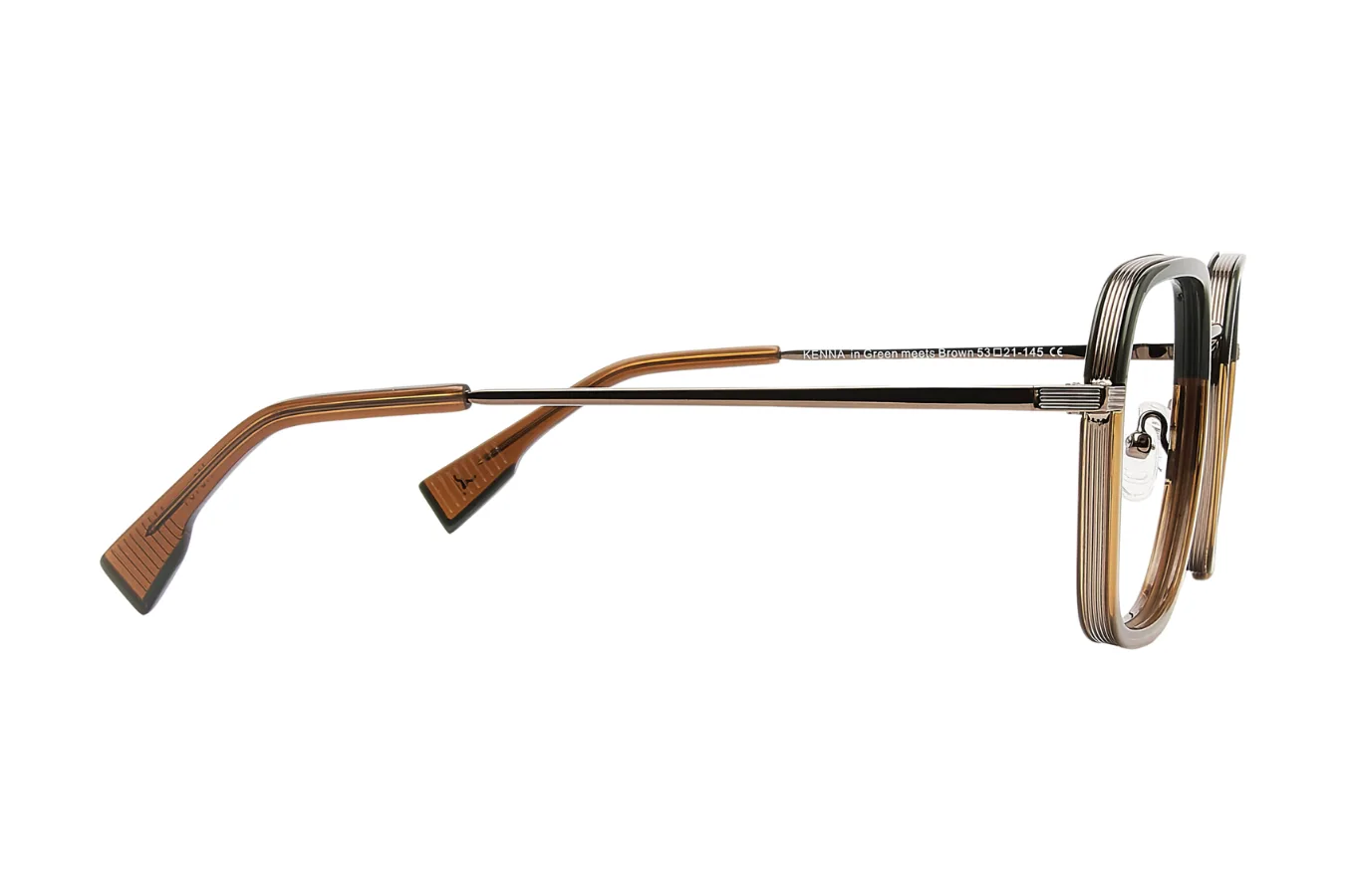 KENNA Green meets Brown rėmeliai grakščiai apjungia klasikinį stilių ir modernų požiūrį į madą. Plonos, tamsaus metalo kojelės elegantiškai tęsiasi nuo rėmelio, užsibaigdamos stilingais geometriniais rudais galiukais su subtiliu linijiniu raštu. Šis rafinuotas dizaino elementas suteikia akinių rėmeliui išskirtinumo ir prabangos pojūtį.