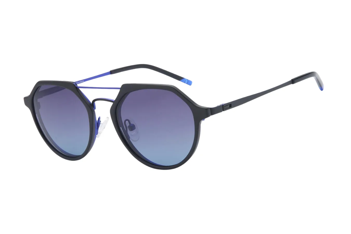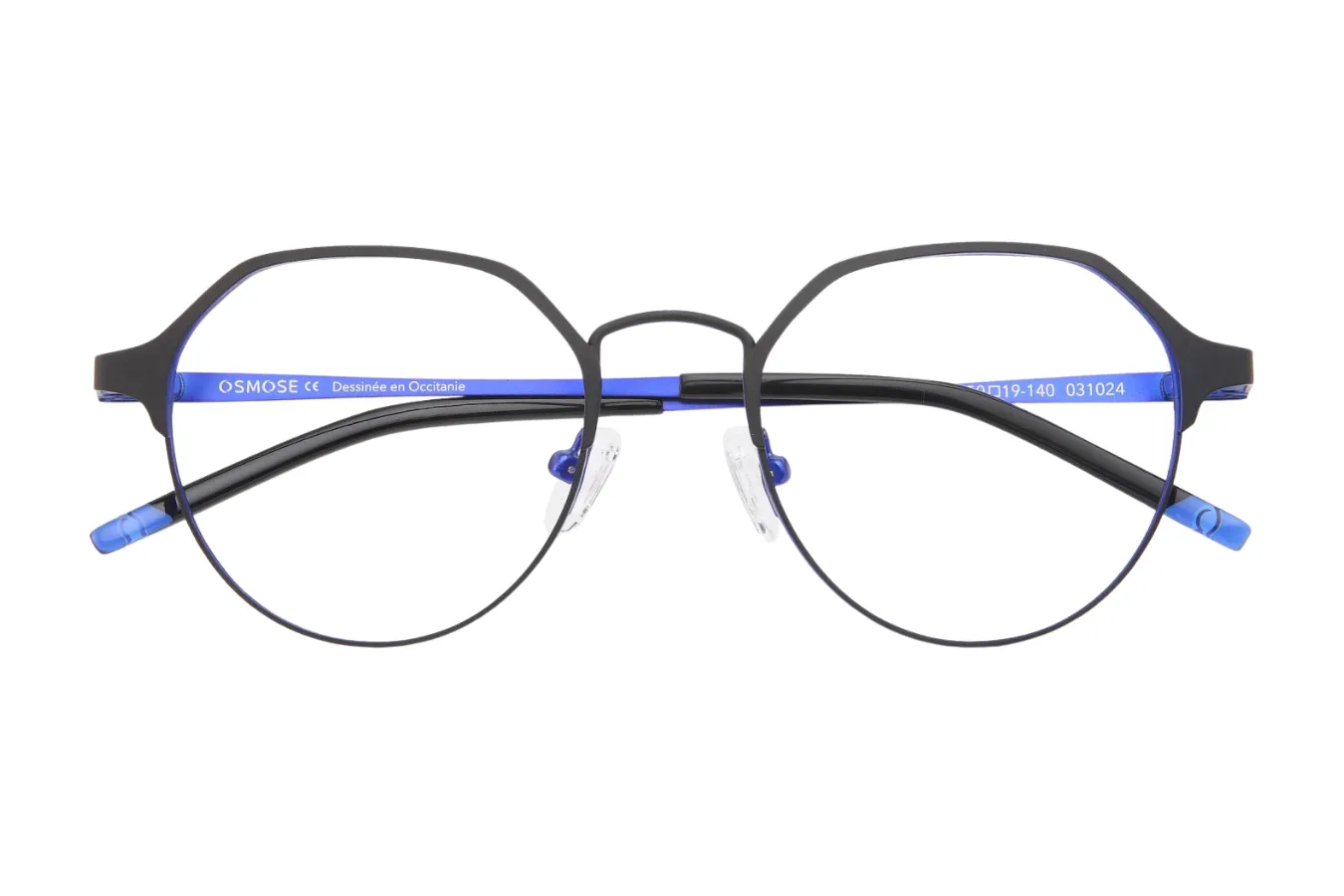 Rėmelis pasižymi šiuolaikišku geometriniu apvaliu dizainu – tai stilingas klasikinės formos ir modernaus kampuotumo derinys. Matinis juodas pagrindinis rėmelis puikiai derinamas su sodriai mėlynomis akcentinėmis detalėmis, kurios matosi kojeles viduje ir jų galiukuose. Šis dviejų spalvų sprendimas suteikia rėmeliui išskirtinę, bet ne pernelyg provokuojančią išvaizdą.