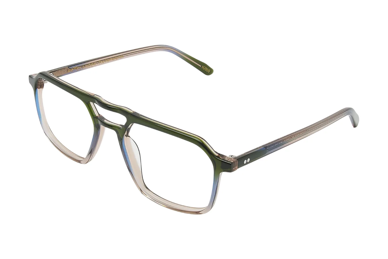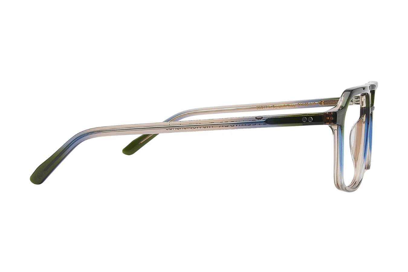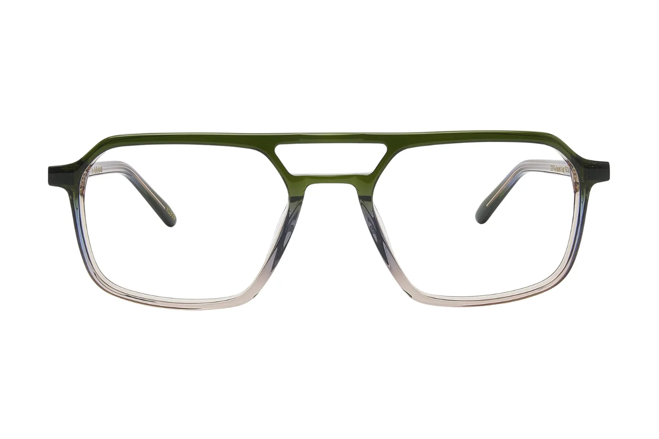 Šie išskirtiniai korekciniai akiniai pasižymi unikaliu dvitonio gradiento dizainu, kuris perteikia tamsiai žalios spalvos viršuje perėjimą į subtilų permatomą smėlio atspalvį apačioje. Architektūrinis dvigubas tiltelis suteikia jiems išskirtinį charakterį ir modernų stilių.
