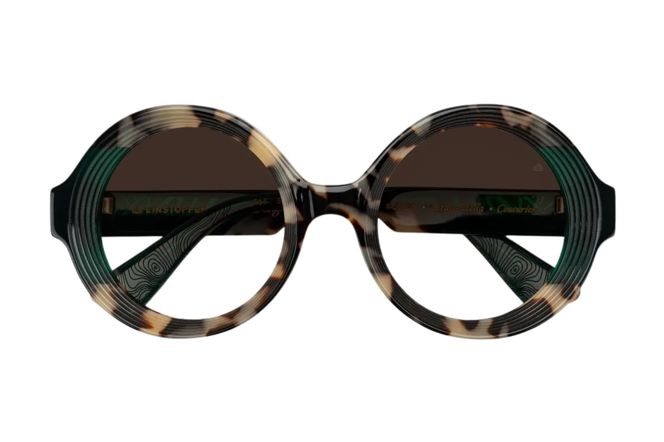 Šie dideli apvalūs akiniai iškart patraukia dėmesį savo drąsiu, vintažiniu dizainu. Couturier modelis pasižymi išskirtiniu dviejų atspalvių deriniu – viršutinę rėmelio dalį puošia prabangus vėžlio kiauto raštas kreminės, rudos ir juodos spalvų derinyje, kuris elegantiškai pereina į gilią slyvų ar tamsiai violetinę spalvą apatinėje rėmelio dalyje.